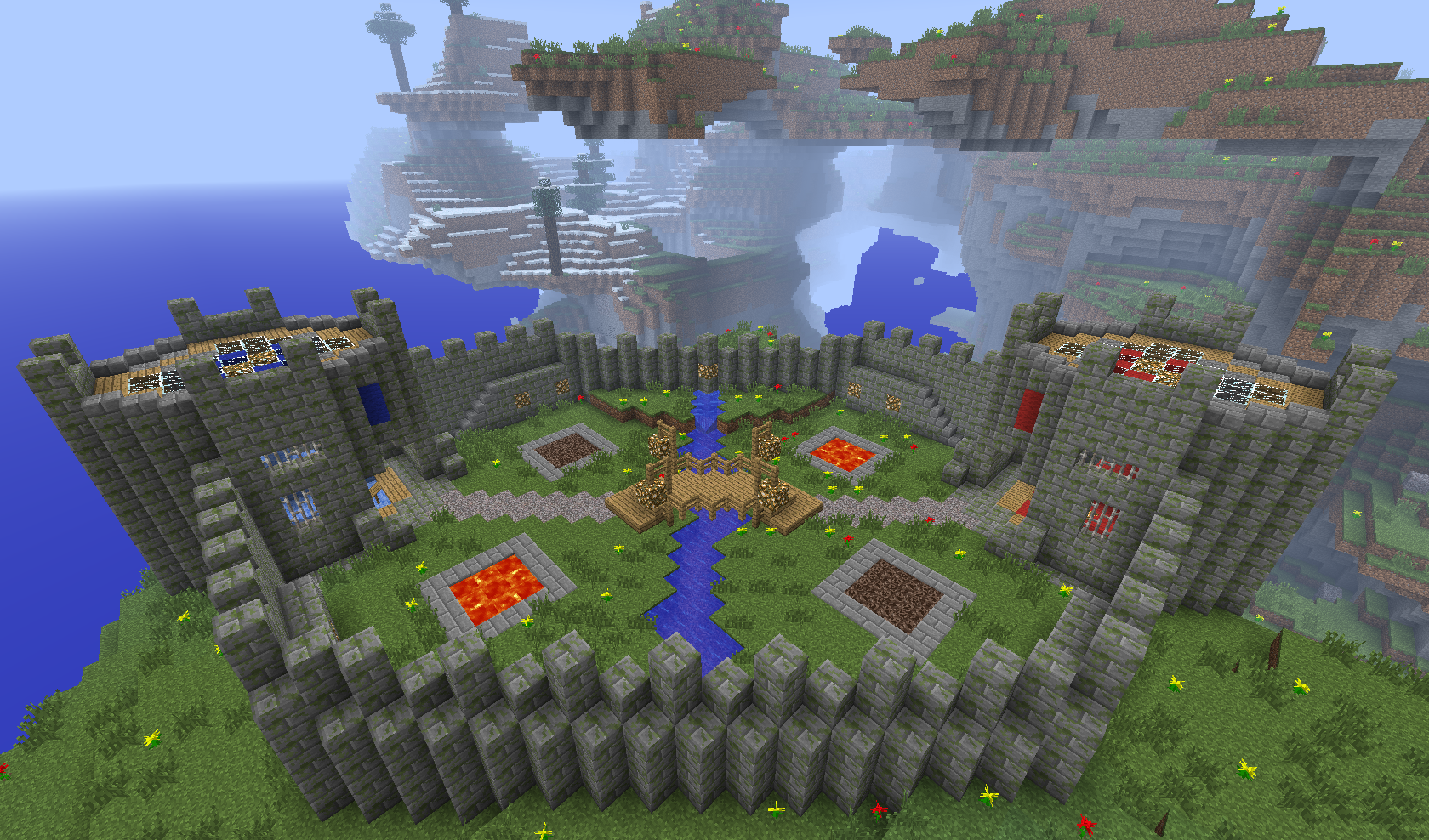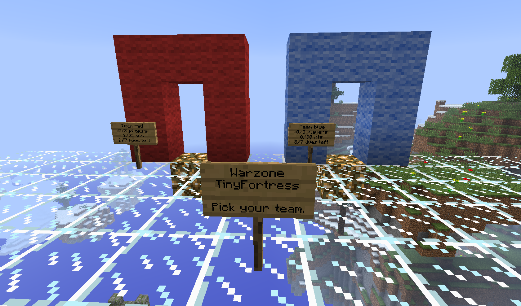 After entering Skylands, just type the command /warzone TinyFortress, which teleports you to the so-called lobby above the battlefield. You split into teams by walking through the gate of the appropriate color. The arena is designed for 3 vs 3 players. For team chat use the command /team [message].