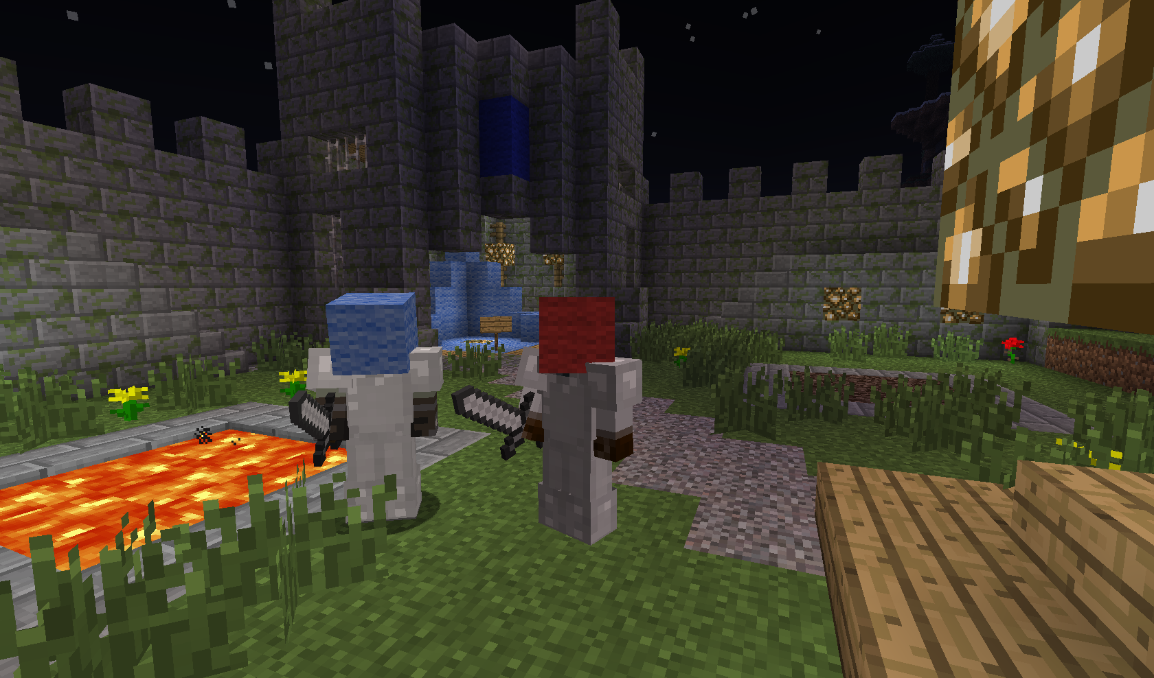 Once the teams are split, the game can begin. Everyone starts at their team’s spawn, which they also return to after death. You can tell your teammates from the opponents by colored blocks instead of helmets. In this arena there are 2 classes to choose from. The default is Knight with a sword and iron armor, and the second is Archer with a bow, 64 arrows and leather armor. The choice of which one you want to play is made by stepping on a pressure plate at spawn. However, once you leave spawn, you can’t choose again when you return, only after death and a new spawn.